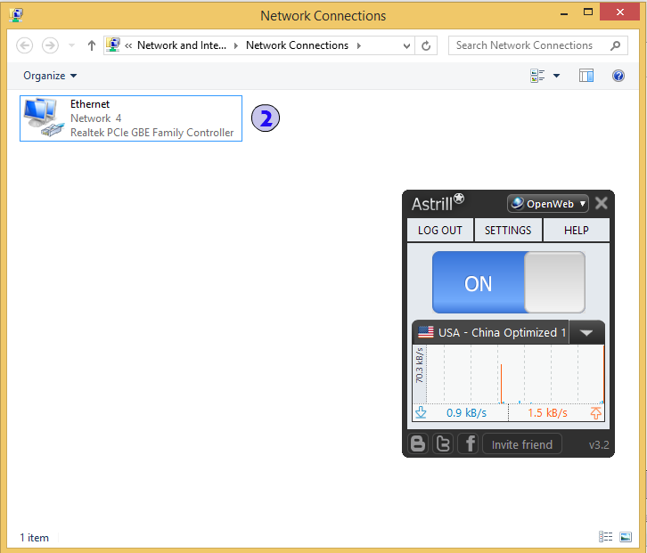 2. By default, it is shown from the Network Connections. If you select "Tap Show/Hide", it will hide Astrill from Network Connections list.