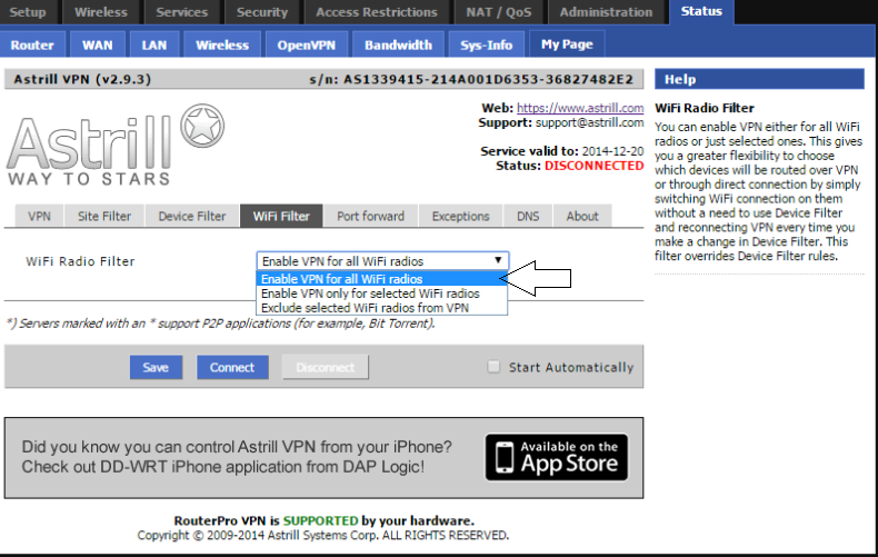 You can enable VPN either for all Wifi radios or just selected ones. This gives you a greater flexibility to choose which device will route over the VPN or through direct connection by simply switching Wifi connection on them without a need to use Device Filter and reconnecting VPN everytime you make a change in Device Filter. This overrides Device Filter rules.