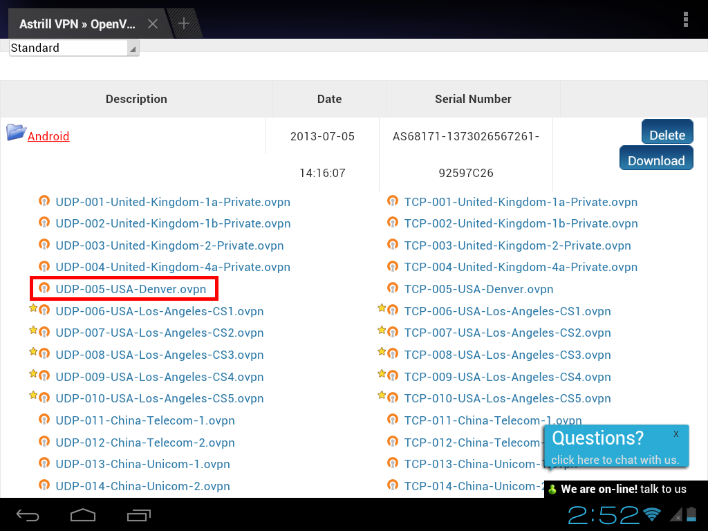 If you wish you can create new certificates for Android tablet or you can use existing OpenVPN certificates/OVPN configs just fine. Tap on the blue folder to expand certificates folder, and select any VPN server location of your choice.