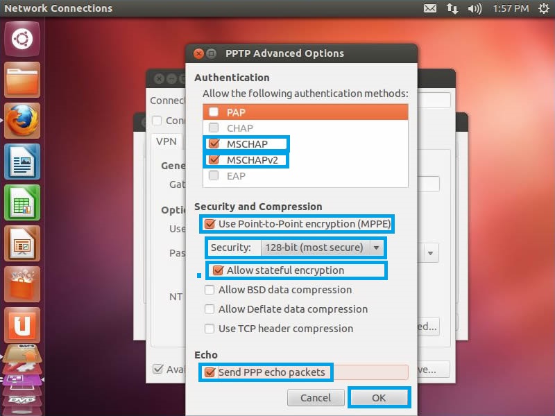 This how to illustrates the configuration of PPTP connection on Ubuntu Linux using the Gnome Network Manager. This setup can also be applied to other Gnome-based desktop Linux distributions. The guide was tested on 12.04 (Ubuntu).