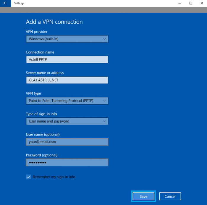 Astrill Setup Manual:How to configure PPTP with Windows built-in client on Windows 10