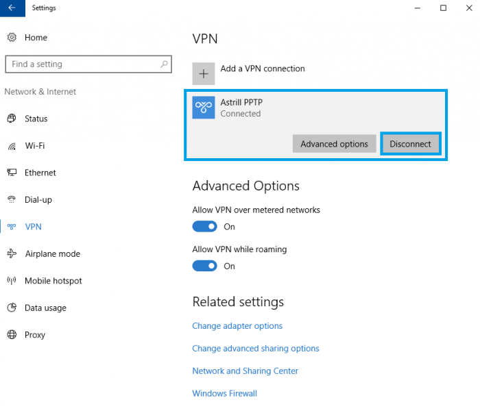 You are now connected to Astrill using PPTP! Just click on Disconnect from this screen at any time to disconnect from the VPN service.