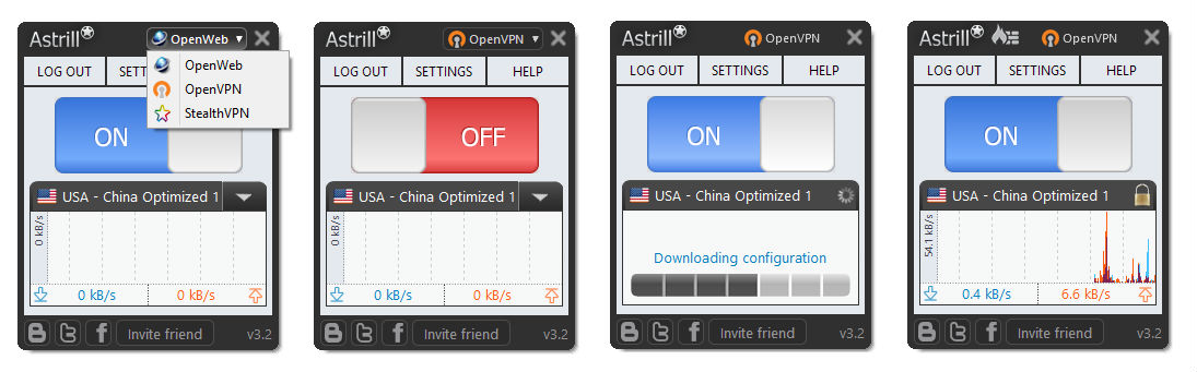 3. You can even switch to Openvpn mode within Astrill application if you want to tunnel internet traffic from all your applications via VPN. Look for Openweb/Openvpn drop down menu in title bar and change to Openvpn mode. Now press on OFF button once to start connecting to the selected server of your choice. Wait a minute and you should be connected when you see a ON button with a lock icon against the server name. If you want to disconnect, simply press the ON button again and it should disconnect from the server.